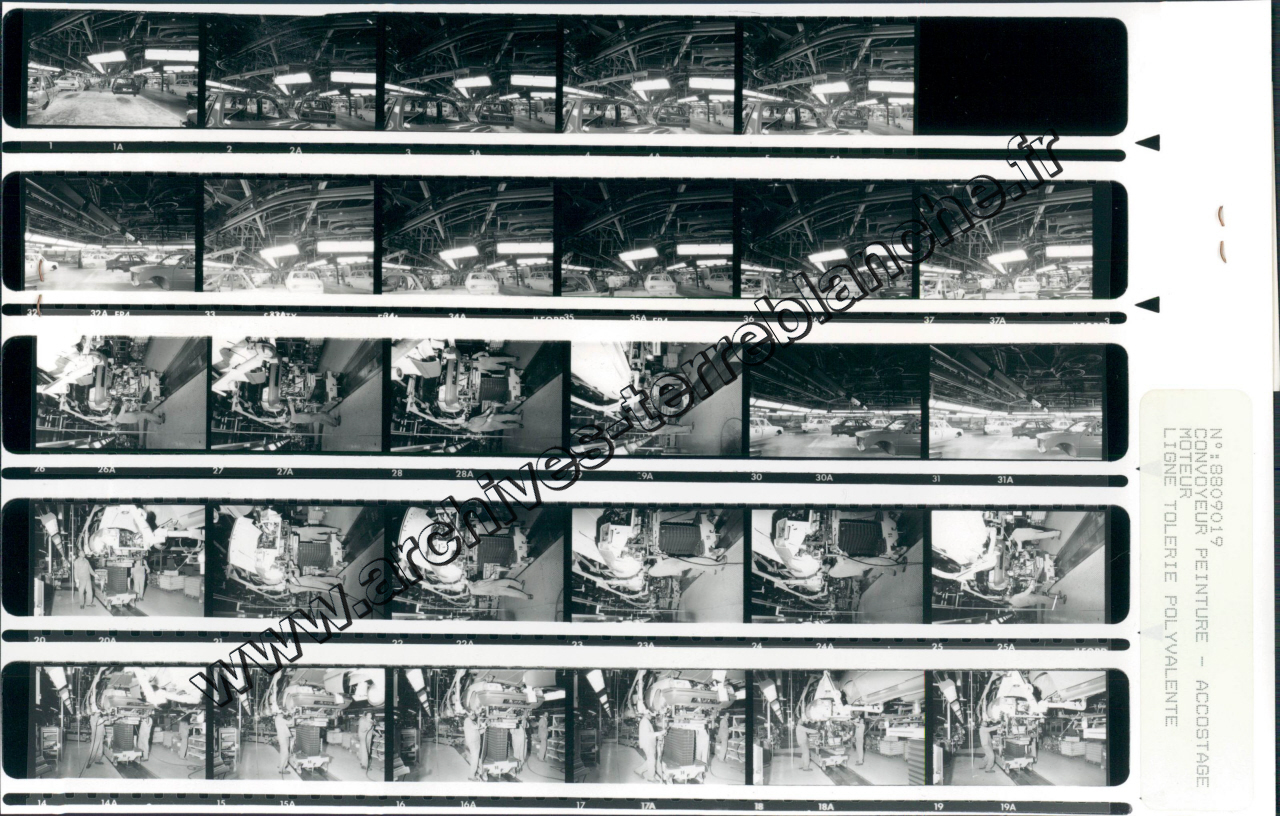 Usine de Poissy.- Convoyeur peinture - accostage moteur. Ligne tôlerie polyvalente