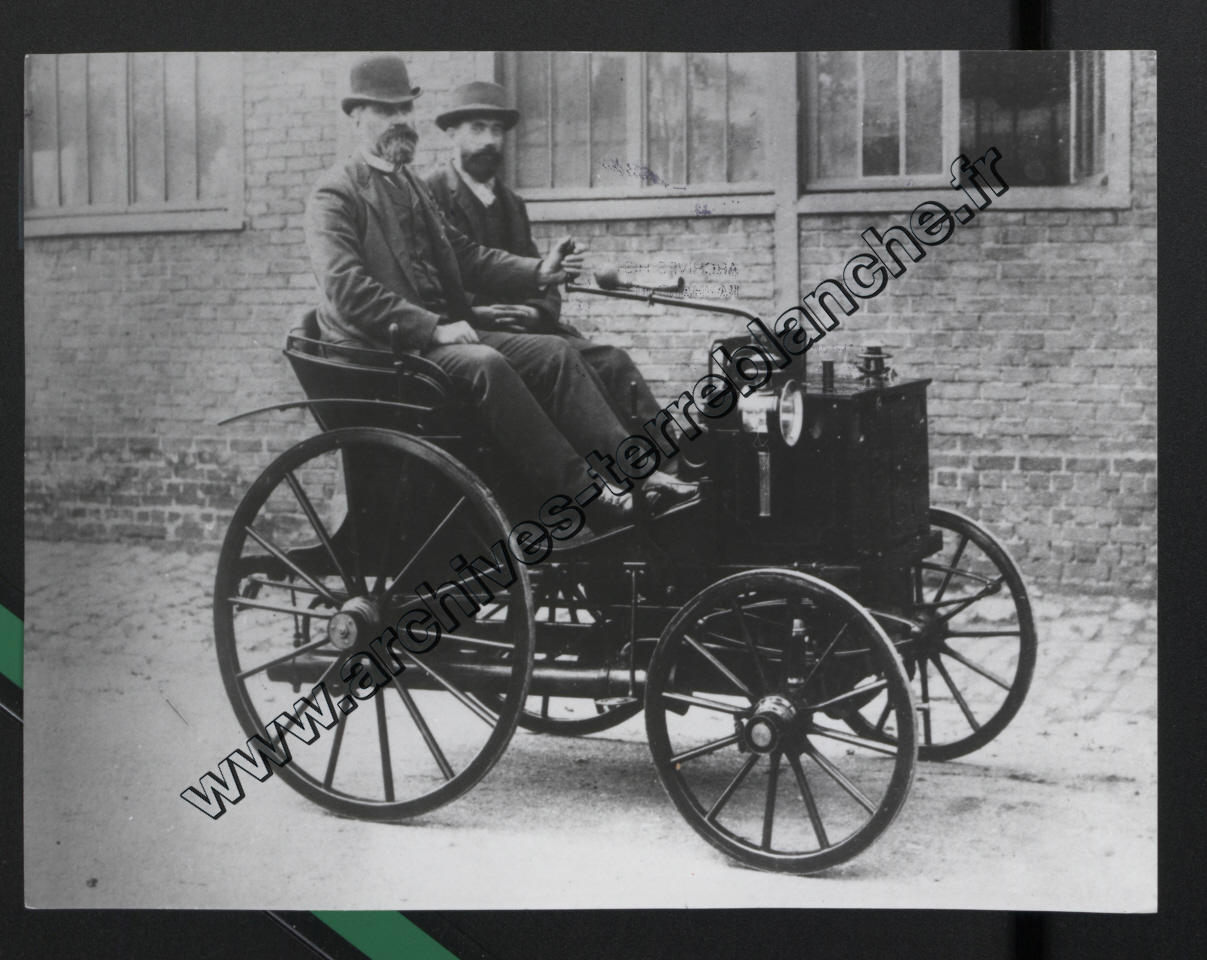 Emile Levassor et Emile Mayade (contremaître) sur voiture deux places dite "Le Crabe".