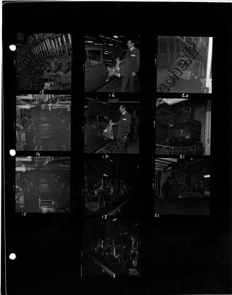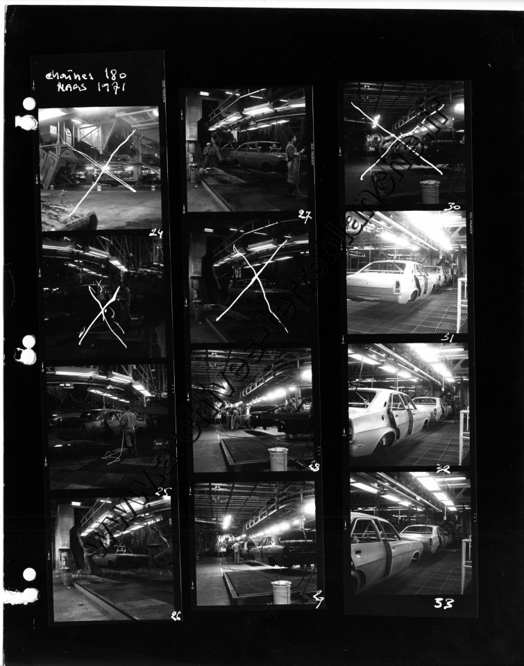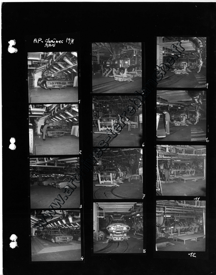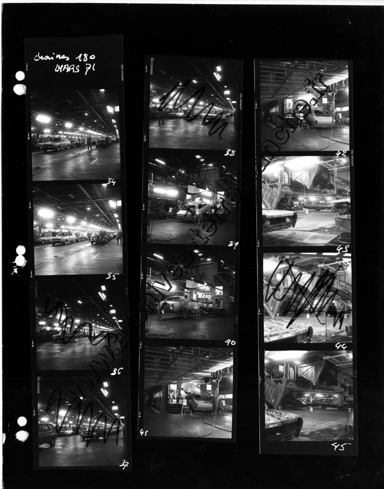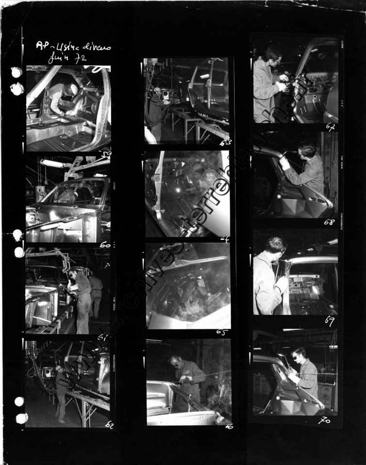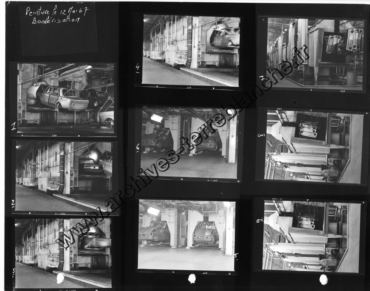 Chrysler France.- Processus de fabrication. 1000000ème Simca 1000, protection trempé mi-caisse, ligne peinture, ferrage, montage (Chrysler 180) , pistolage laque, retouche peinture bout d'usine, bondérisation, phosphatation (Simca 1000) (Poissy, Tours)