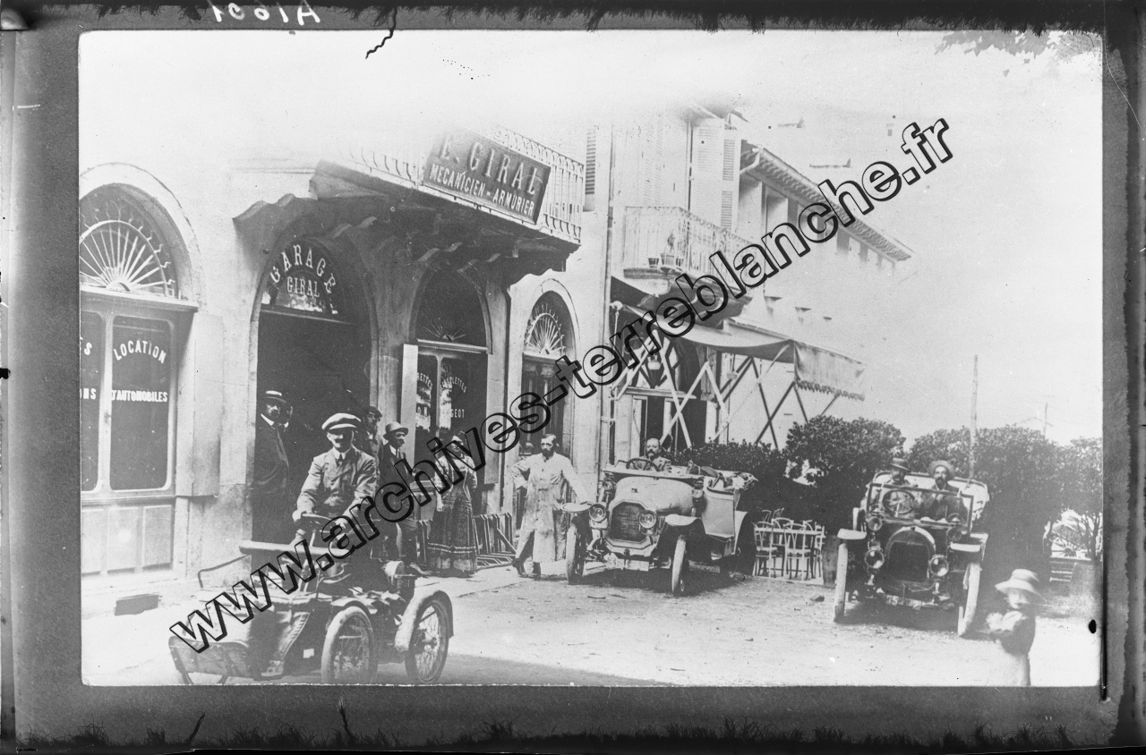 Trois voitures "Lion Peugeot" devant une enseigne "E. Giral. Mécanicien - Armurier." dont celle de gauche type VD/V4D deux places moteur quatre cylindres en V puissance 10 HP.