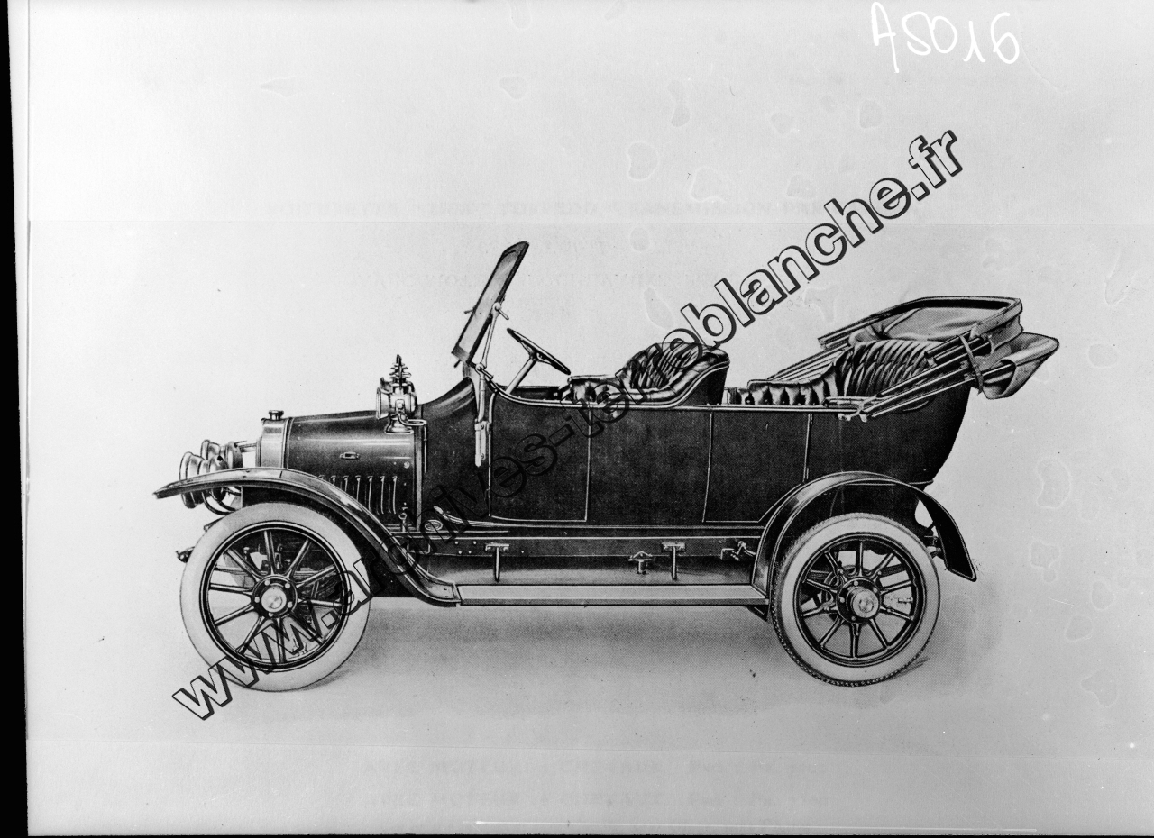 Voiture "Lion Peugeot" quatre places moteur deux cylindres en V puissance 12 HP transmission à cardan.