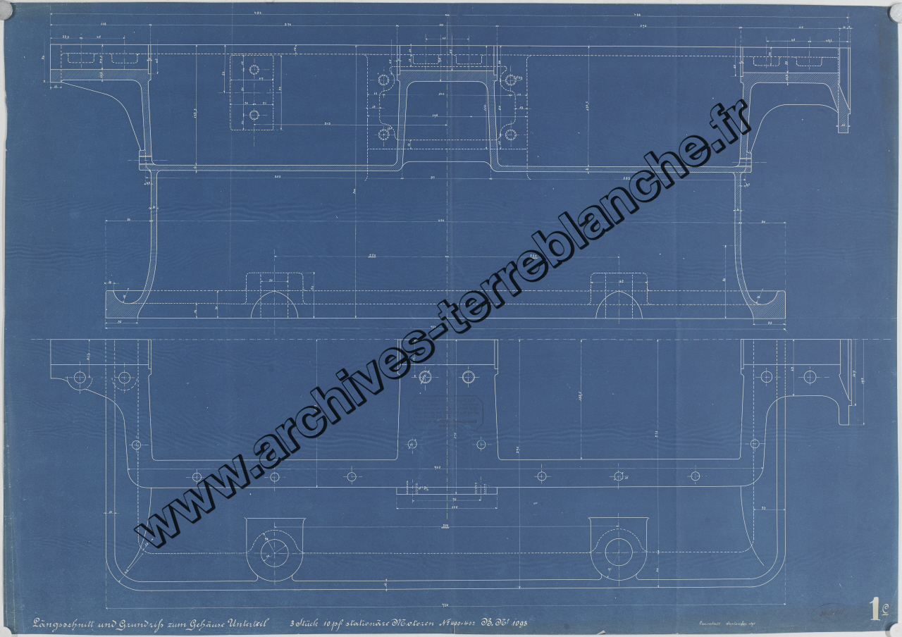 Moteur fixe Daimler n°400 à 402 B1095 10 chevaux 2 cylindres 3 pièces , sous ensemble partie inférieure logement moteur : coupe longitudinale et plan de sol