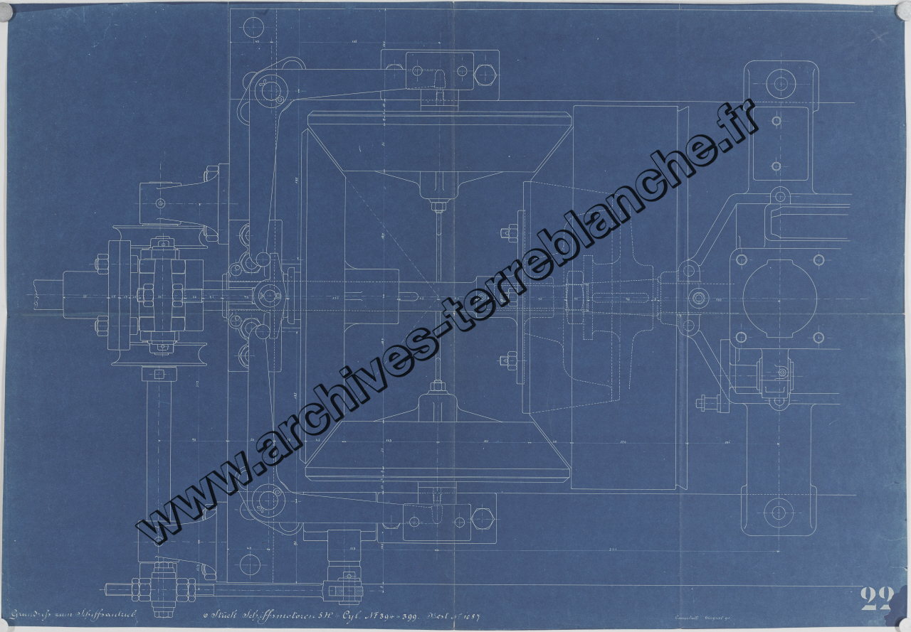 Moteur fixe Daimler [pour navires] n°394 à 399 B1087 5 chevaux 4 cylindres 6 pièces, sous ensemble mécanisme propulsion [plan d'étage] : vue d'ensemble