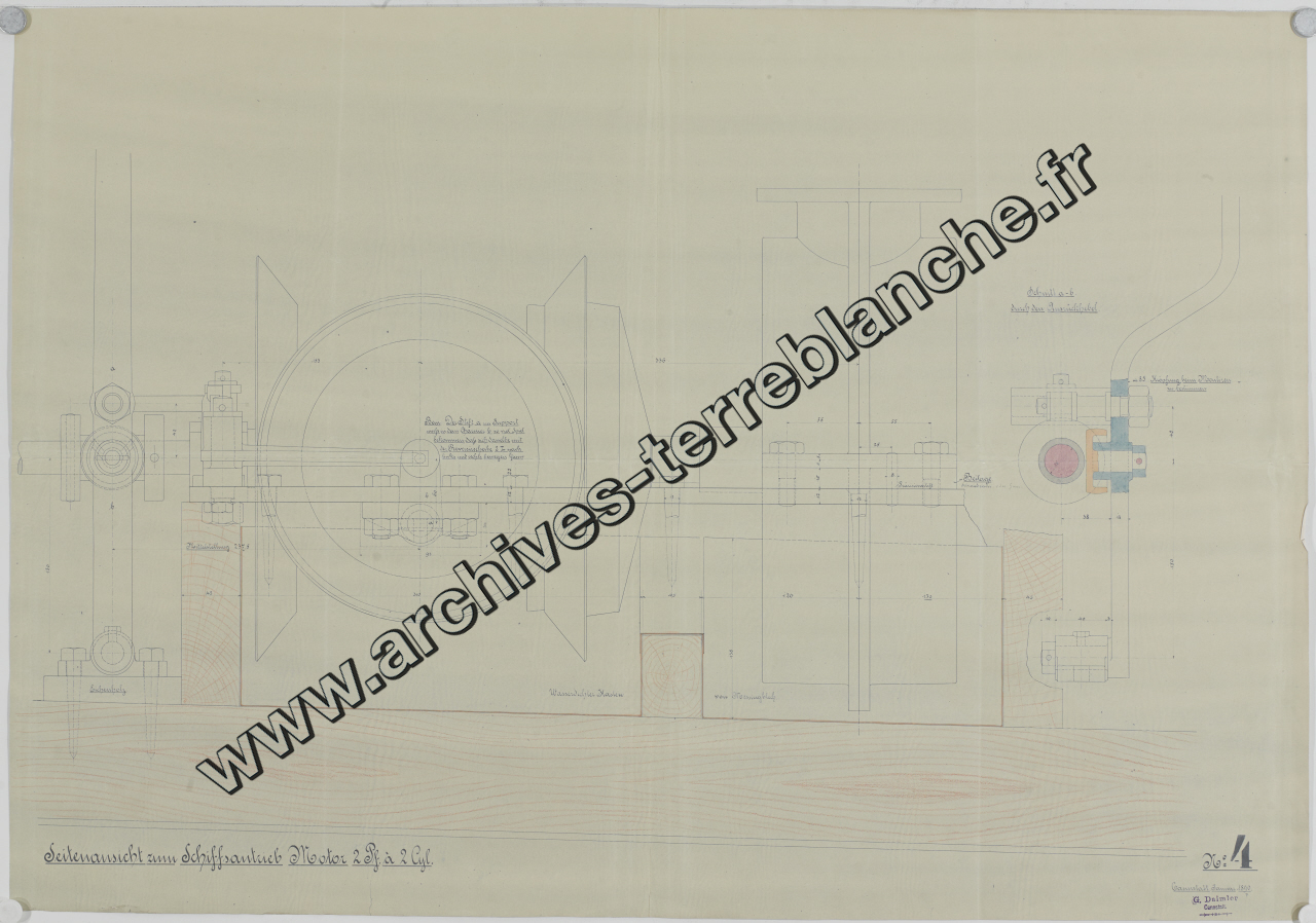 Moteur fixe Daimler [pour navires] 2 chevaux 2 cylindres, sous ensemble logement : vue de côté