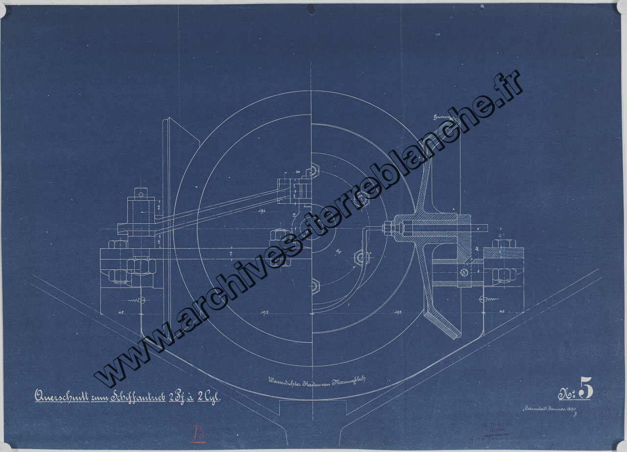Moteur fixe Daimler [pour navires] 2 chevaux 2 cylindres, dispositions [pièces] : coupe transversale