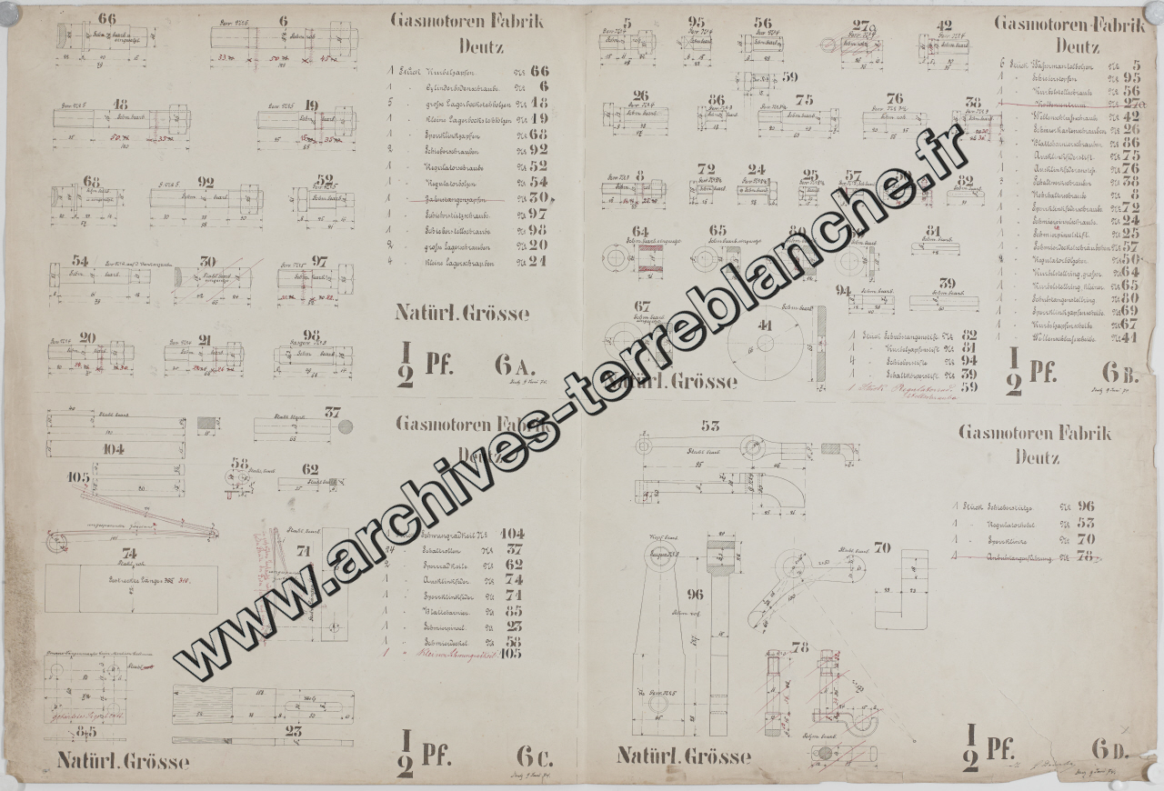 Moteur fixe Deutz [à gaz] 1/2 cheval, écrous, vis et parties régulatrices : plan d'ensemble