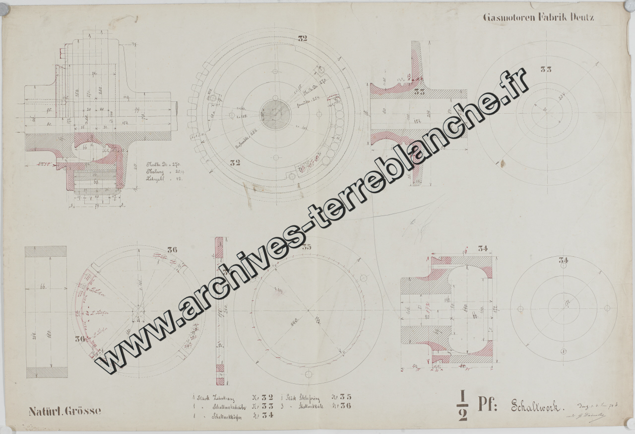 Moteur fixe Deutz [à gaz] 1/2 cheval, sous ensembles crémaillère et disque de friction : plan d'ensemble