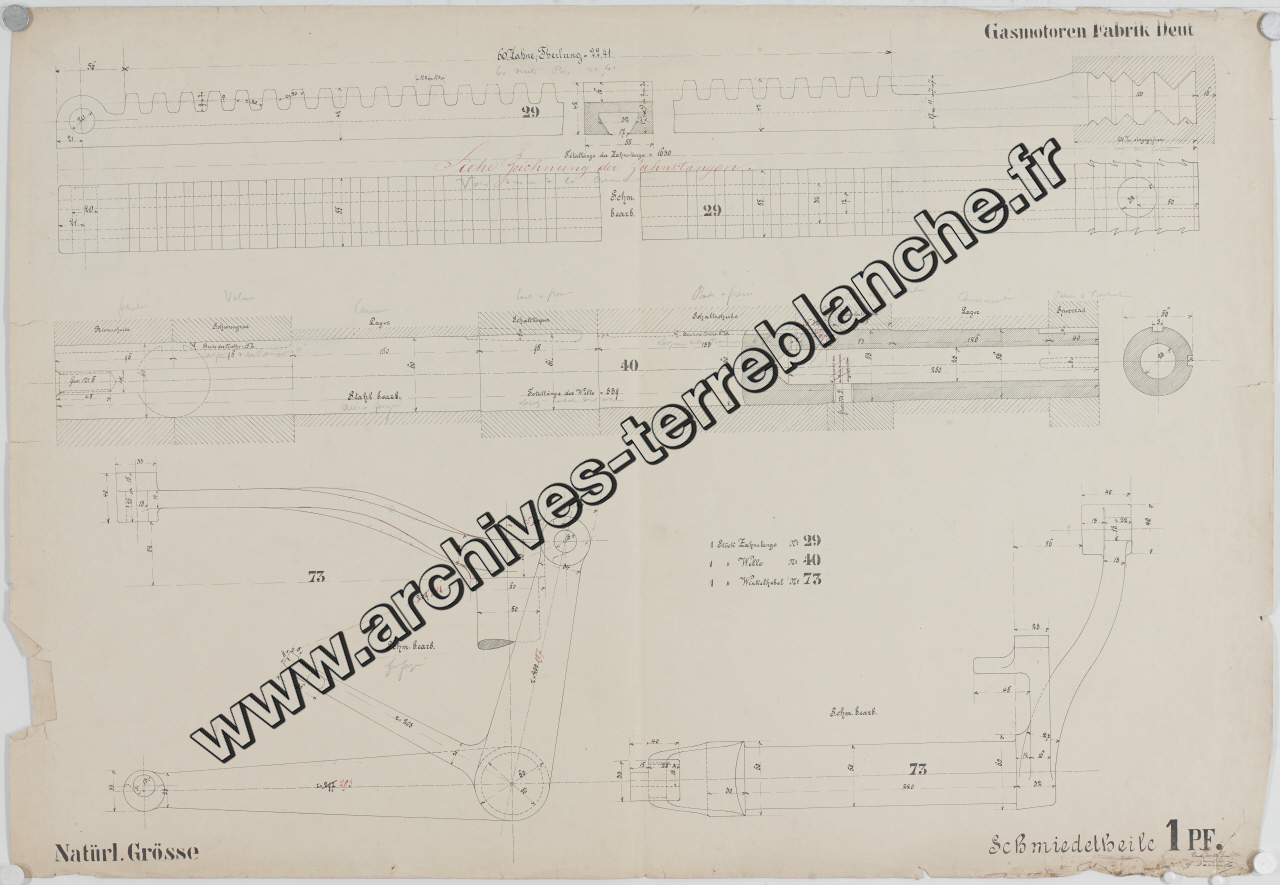 Moteur fixe Deutz [à gaz] 1 cheval, pièces en fonte [crémaillère et bielles] : plan d'ensemble
