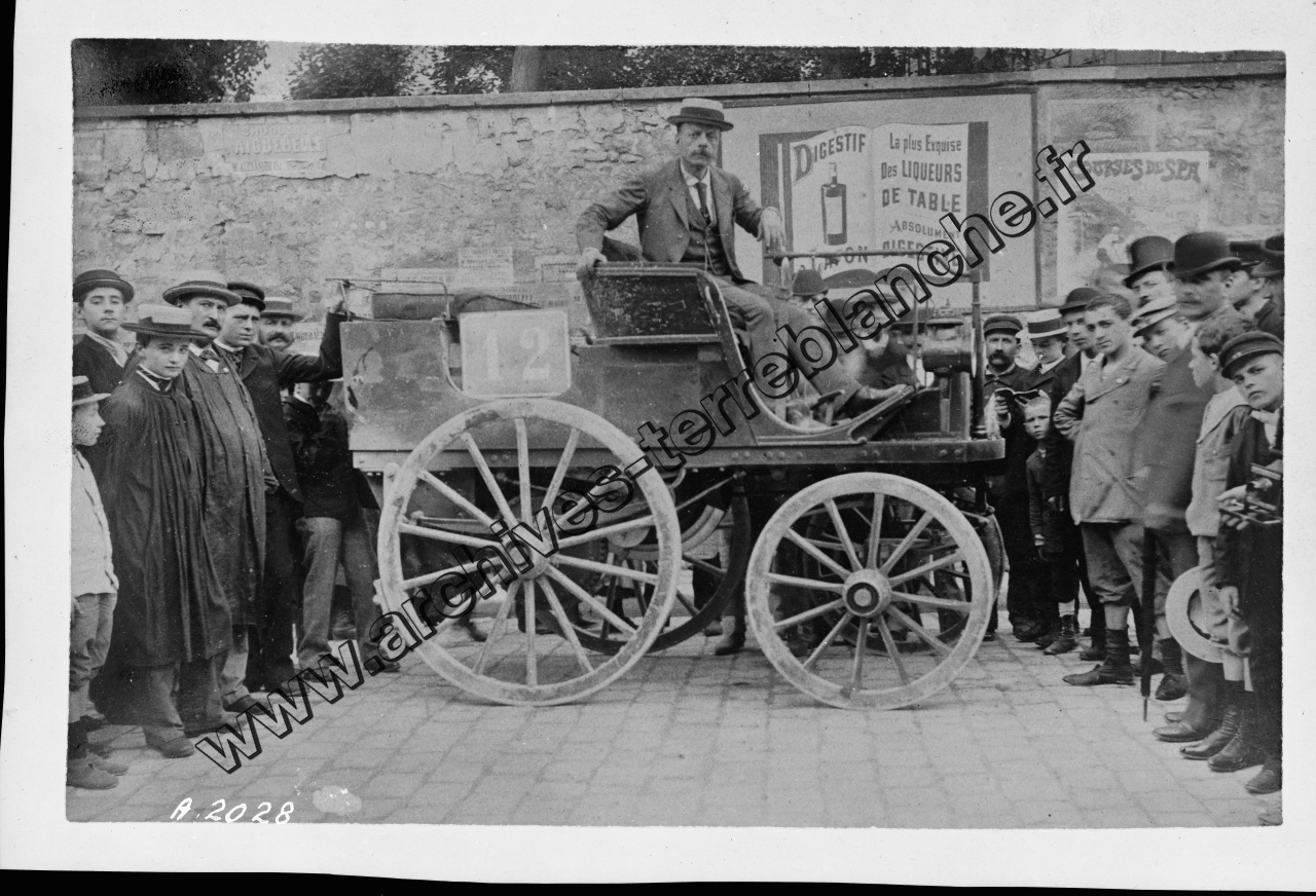 Concours pour voitures sans chevaux Paris-Rouen organisé par le Petit Journal.- Voiture n°12 quatre places moteur à pétrole. Individus présents autour de la voiture.