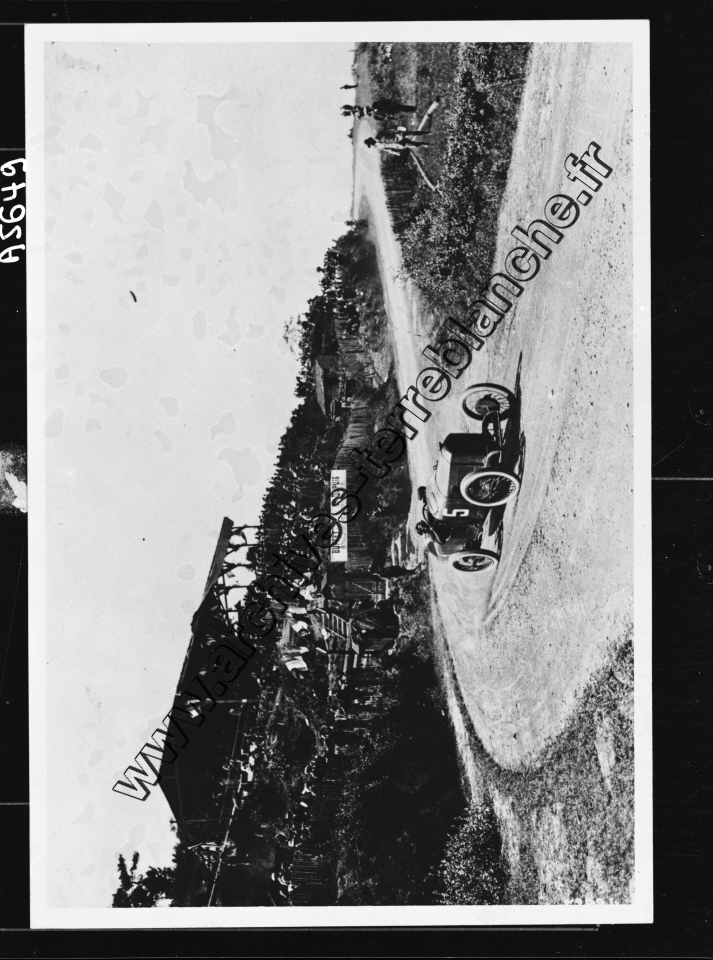 Grand Prix de l'Automobile Club de France (ACF) de Lyon.- Georges Boillot dans la Peugeot L76 EX5 n°5 dans un virage, spectateurs dans les gradins au second plan.