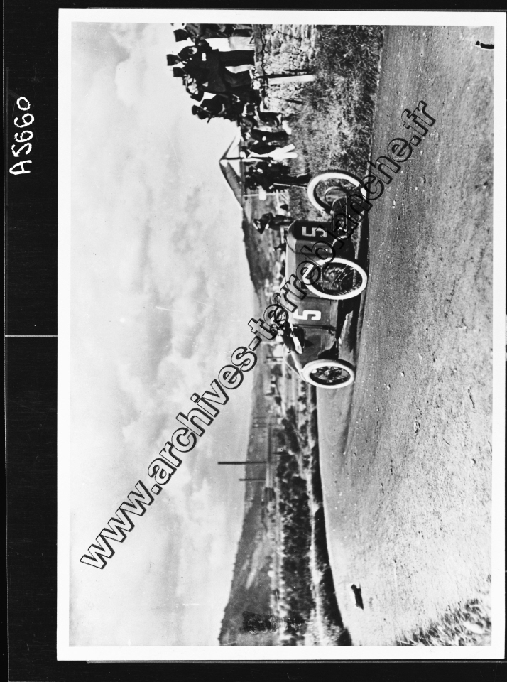 Grand Prix de l'Automobile Club de France (ACF) de Lyon.- Georges Boillot dans la Peugeot L76 EX5 n°5 dans un virage, spectateurs de part sur le côté gauche de du circuit.