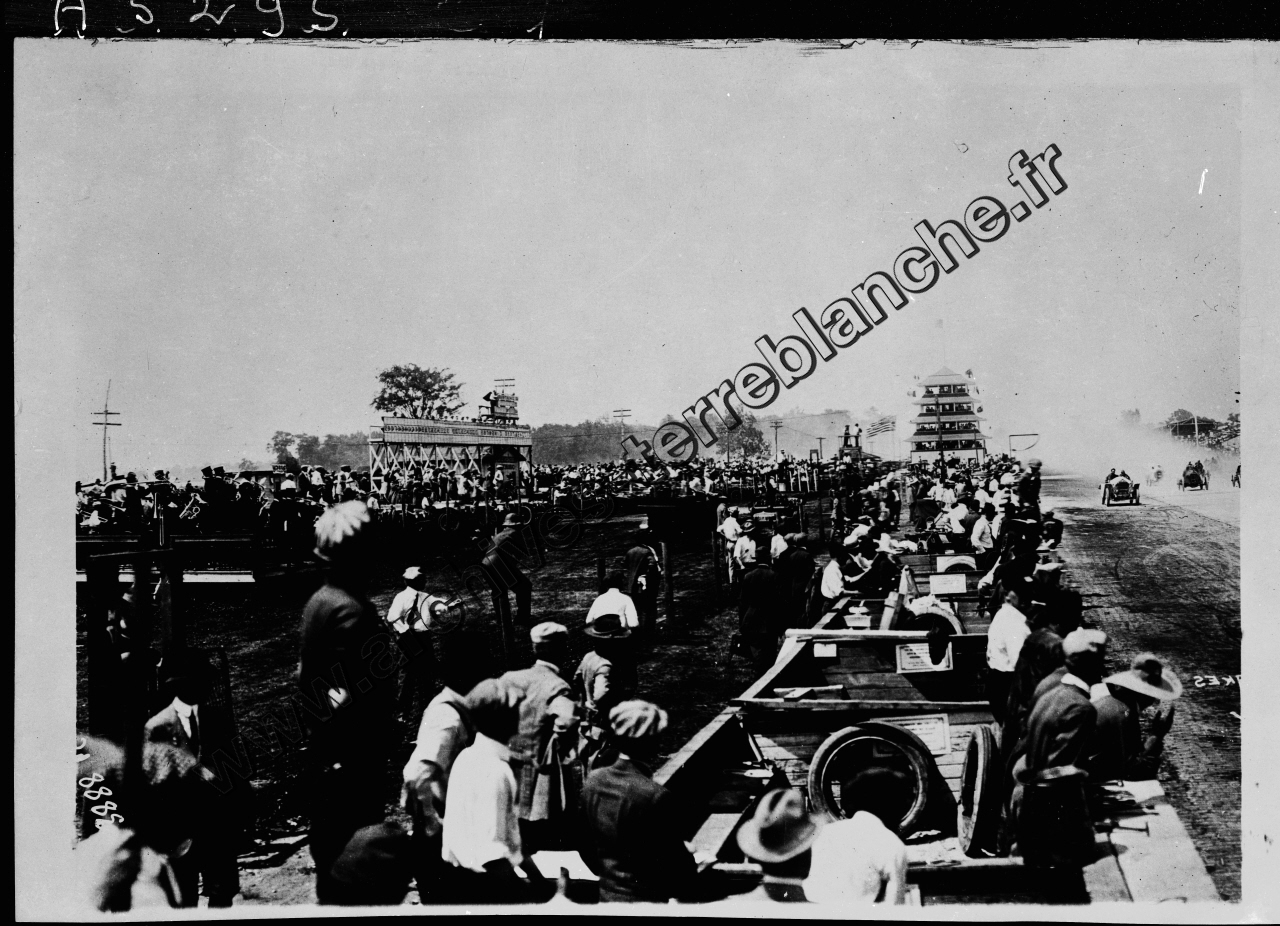Grand Prix d'Indianapolis.- Vue des stands, du public sur le côté gauche et de voitures de course sur le côté droit.