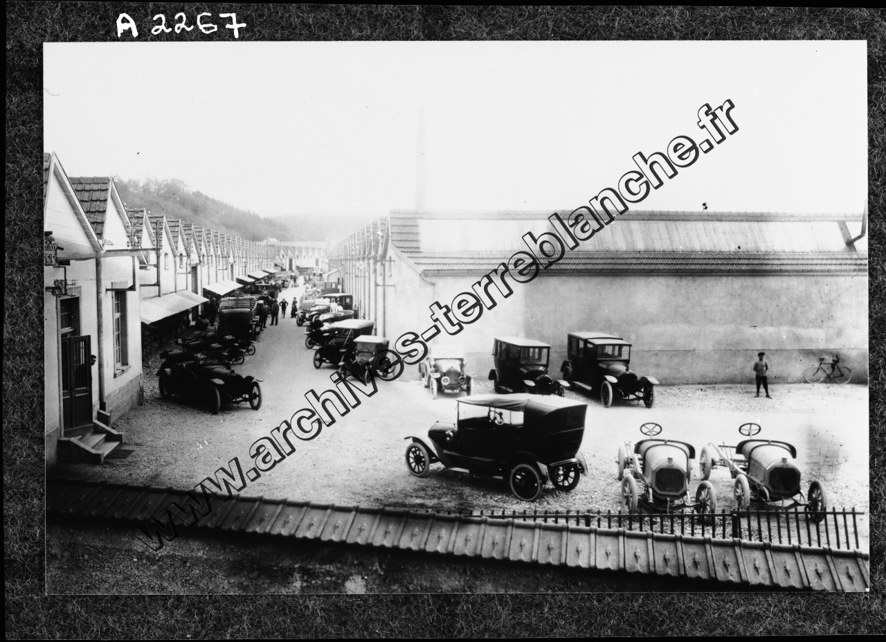 Carrosserie de Mandeure, vue extérieure avec de nombreuses voitures garées dans une cour et une allée de l'usine.