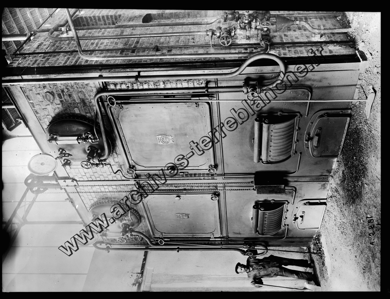 Ouvrier à côté d'un four industriel (haut fourneau ?). Inscription : "Fonderie et ateliers de la Courneuve"