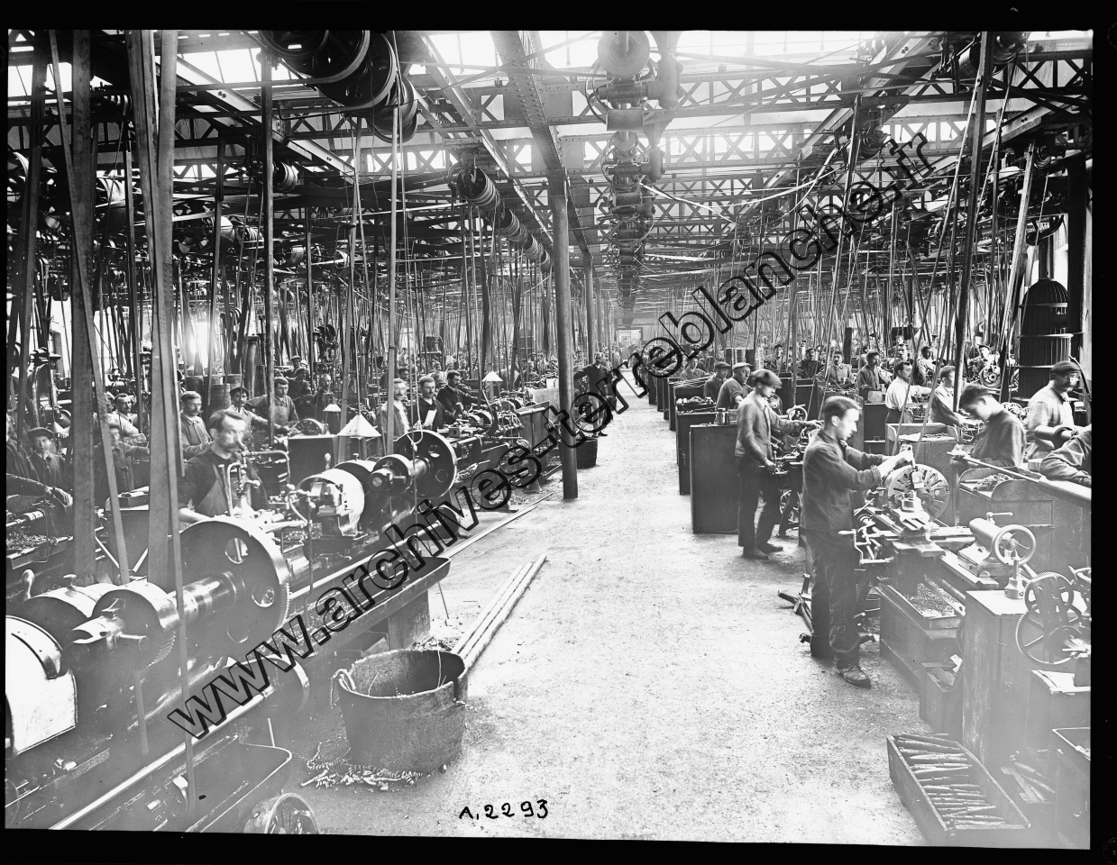 Mandeure. - Atelier de tournage « vélos ». Même cliché que 01504. - Forêt de courroies. Présence d'ouvriers