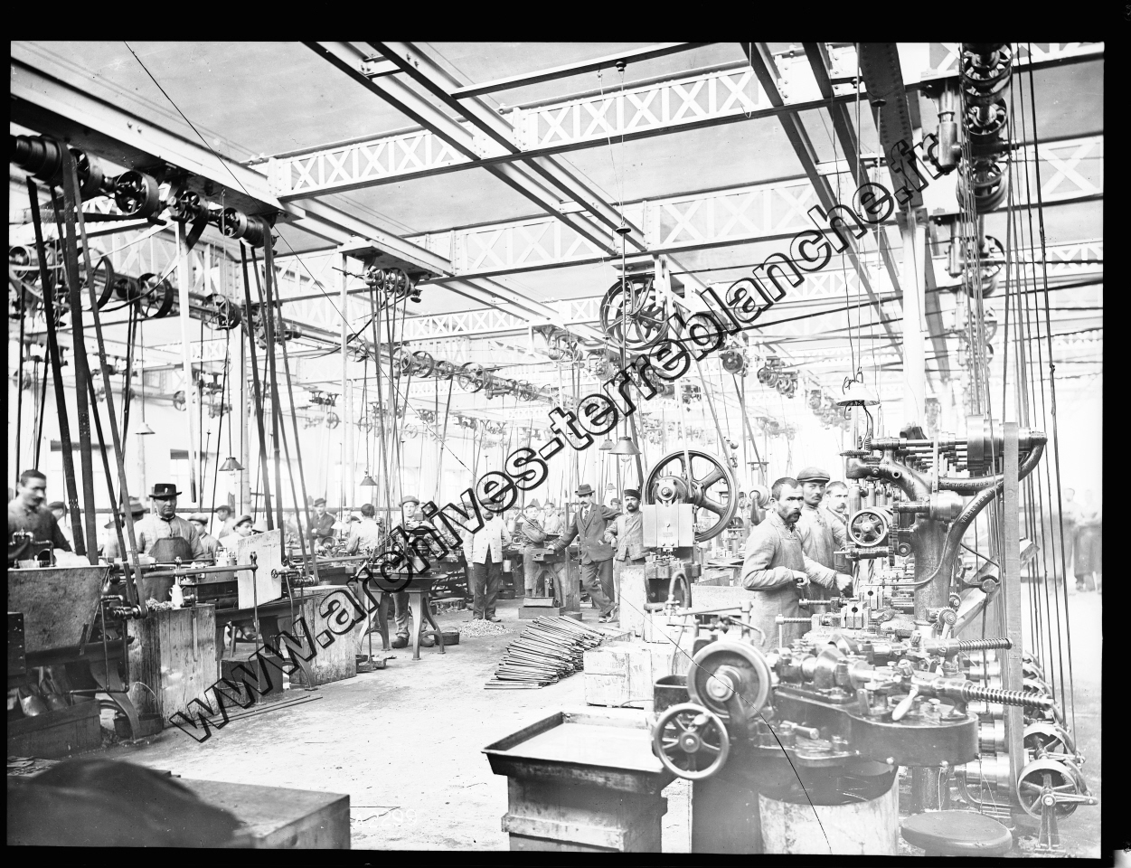 Beaulieu. - Perceuses à colonne. Toiture : poutres en treillis sur piliers métalliques carrés. Atelier de perçage, tournage et fraisage. Présence d'ouvriers et d'un homme de direction.