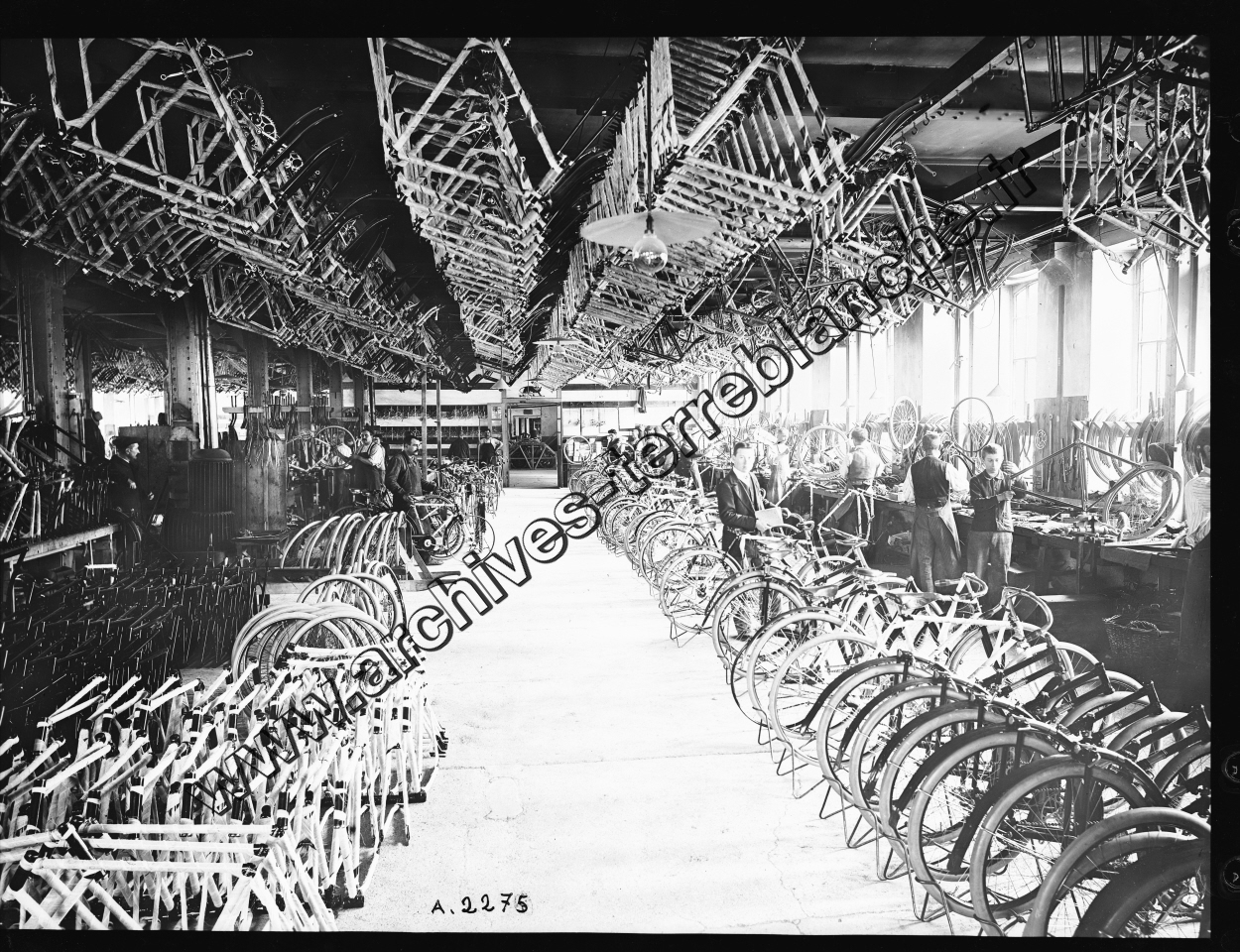 Usine de Beaulieu. - Atelier vélos « montage fini »Après le montage des roues, chaque vélo repose sur un support de roue, présence d'ouvriers.