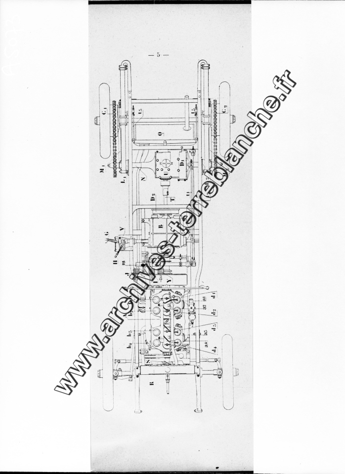 Plan d'un châssis de voiture moteur un cylindre puissance 9 HP.