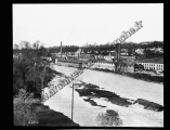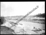 Individus sur un pont au-dessus d'une rivière (Doubs) , usine de Valentigney au second plan.